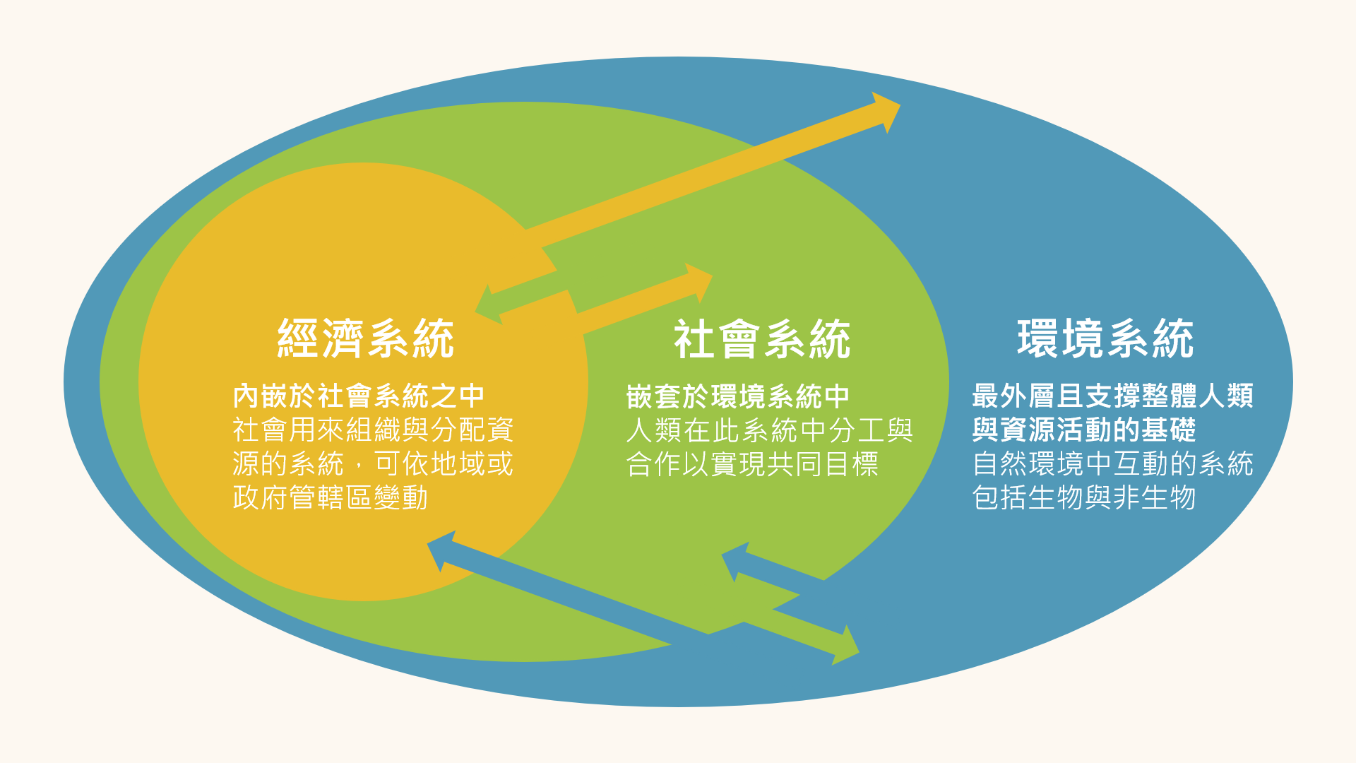 循環經濟概念似單指經濟系統,實際上還考量了社會系統及環境系統。ISO 59004 標準中明確界定循環經濟應同時考量這三大系統及其互動關係,不能獨立運作。如圖1所示,標準清楚闡述循環經濟中三大系統如何互相作用,及系統各自所代表的涵義。