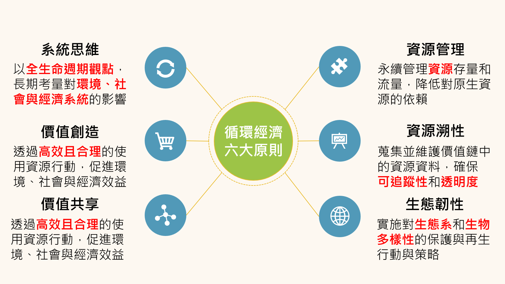 依據 ISO 59004,循環經濟應建立在六大原則之上,作為所有循環行動的共同基礎。如圖2所示,系統思維、價值創造、價值共享、資源管理、資源溯性及生態韌性六項原則界定了在推動循環經濟時,必須同時納入多面向的考量,以確保行動符合循環經濟理念。