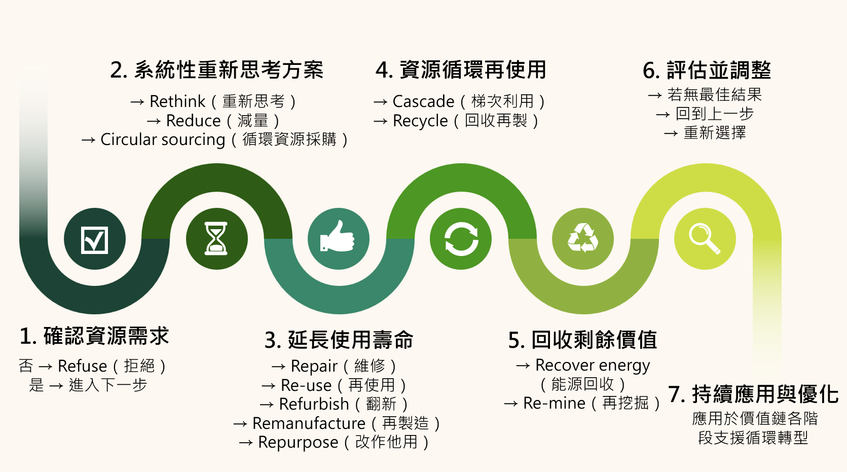 企業承諾遵循循環經濟標準後,如何判斷資源應被保留、再使用或淘汰,成為需謹慎面對的課題。圖 4 所示的資源管理流程,以七個步驟引導企業評估資源價值,確保其效益能被充分發揮。透過此流程,不僅能避免資源過早被棄置為廢棄物,更能延長其生命週期,實現資源的循環利用與價值最大化。
